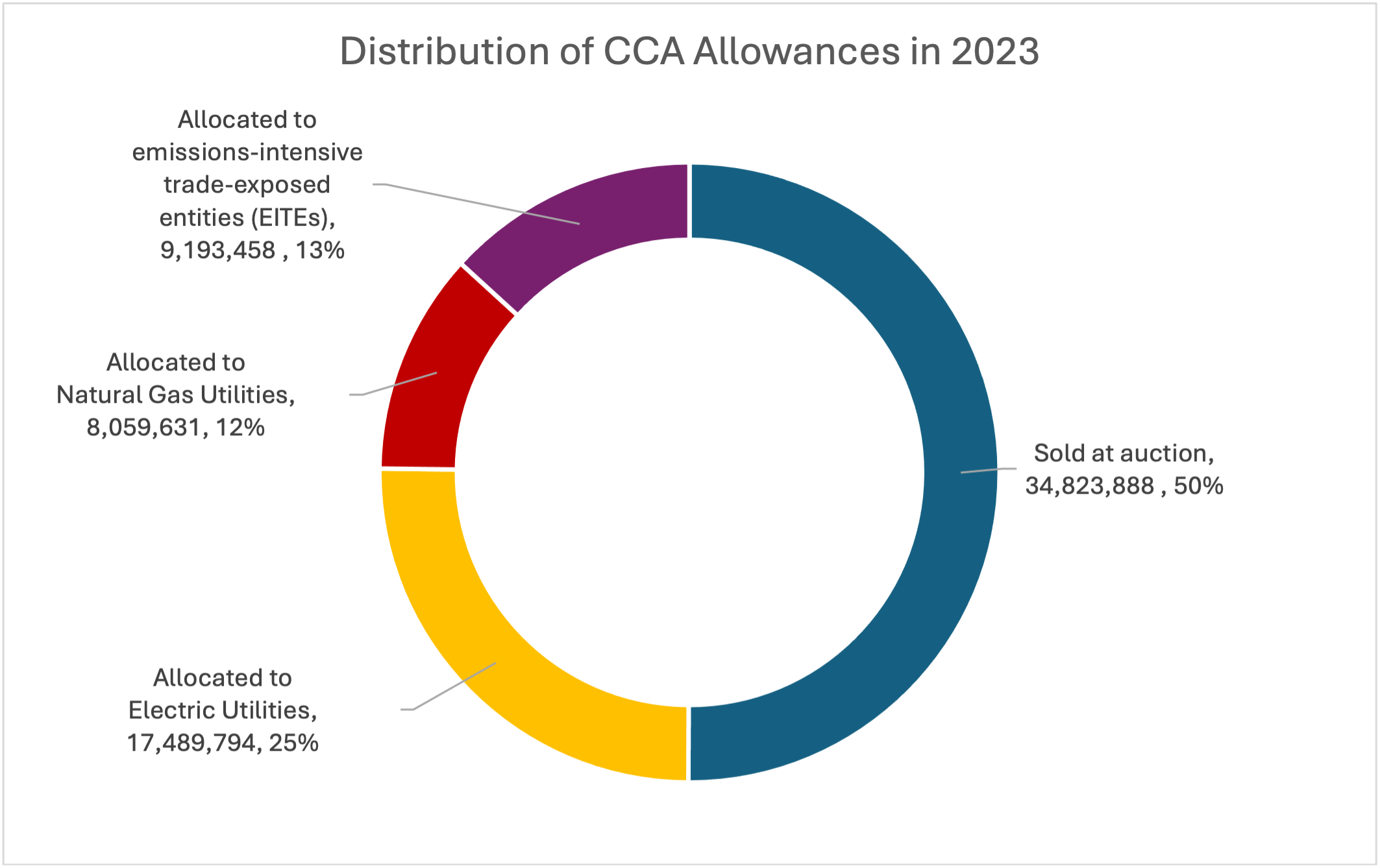 This chart shows how emission allowances were distributed in 2023. This picture will change from year to year because the number of no-cost allowances declines over time. Note that 1 allowance covers 1 metric ton of GHG emissions.
