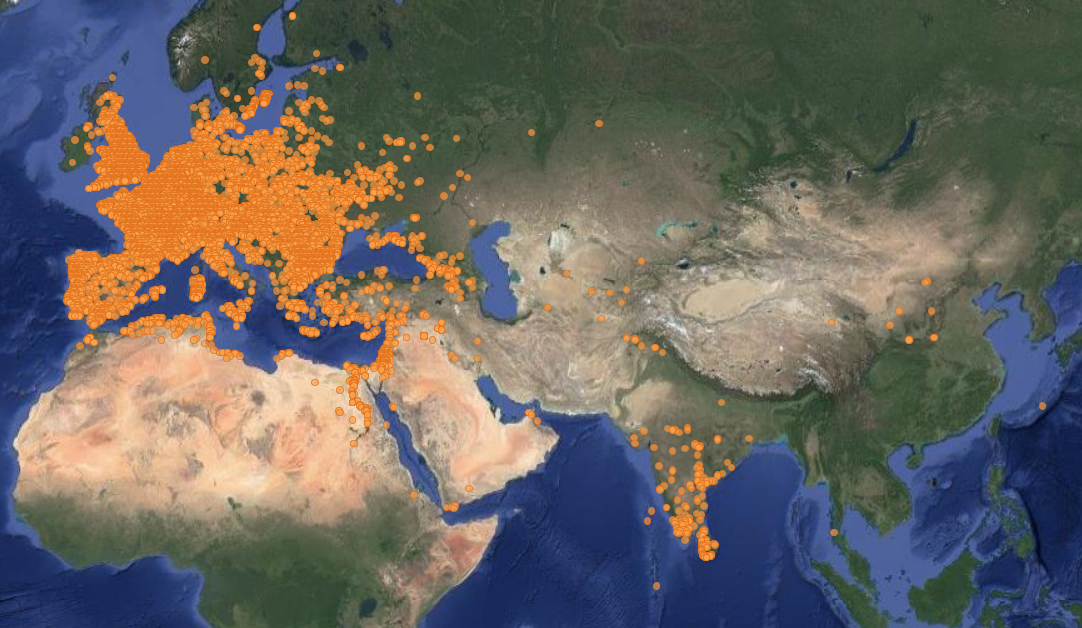 Dalrymple describes how trade between India and Rome increased dramatically after the Battle of Actium in 31 BCE, when Augustus defeated Antony and Cleopatra and brought Egypt under Roman control. Huge quantities of Roman gold and silver flooded into the port cities of western India, so much so that the Roman author and scientist Pliny the Elder described India as “the sink hole for the world’s precious metals.” [p. 66] You can still see evidence of this today. Some enterprising folks at Oxford University have been mapping the locations of hordes of Roman coins discovered all over the world. I was surprised by how many have been found in India.